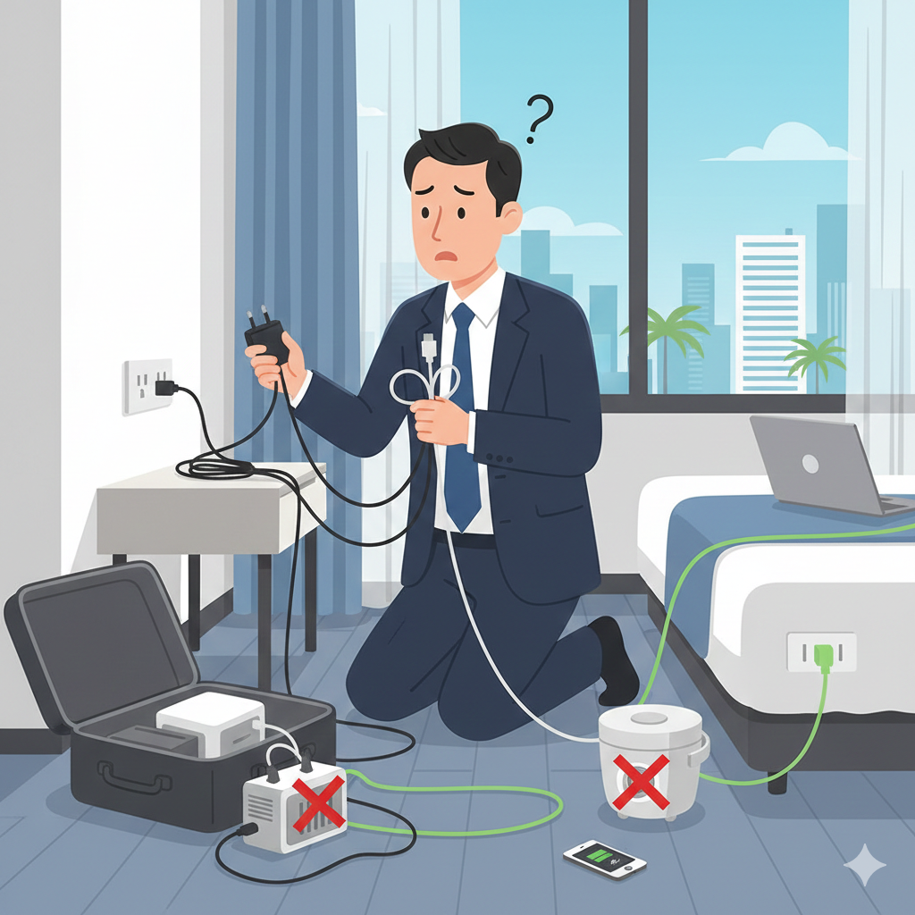 - 結論: 炊飯器やドライヤーを使いたいなら、変圧器を買うよりも**「海外対応(240V対応)の製品」を買い直す**ほうが、遥かに安くて軽く、安全です。ビジネス出張で変圧器が必要になるシーンは、2026年現在まずありません。